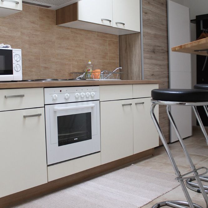 Küche mit Herd, Dunstabzug, Kühlschrank, Spüle und genügend Stauraum